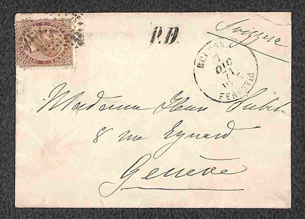 1869/1871 - Piccolo insieme di 5 bustine affrancate con 30 cent (19) di varie tonalità da Bologna e Firenze per la Svizzera