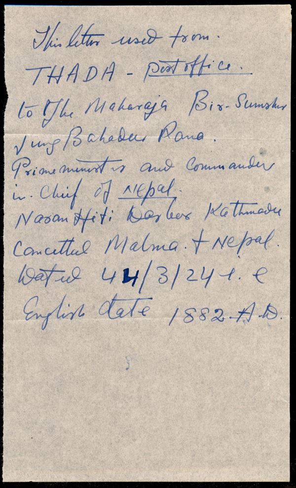 1882 - Busta da Thada per il Nepal indirizzata al Primo Ministro