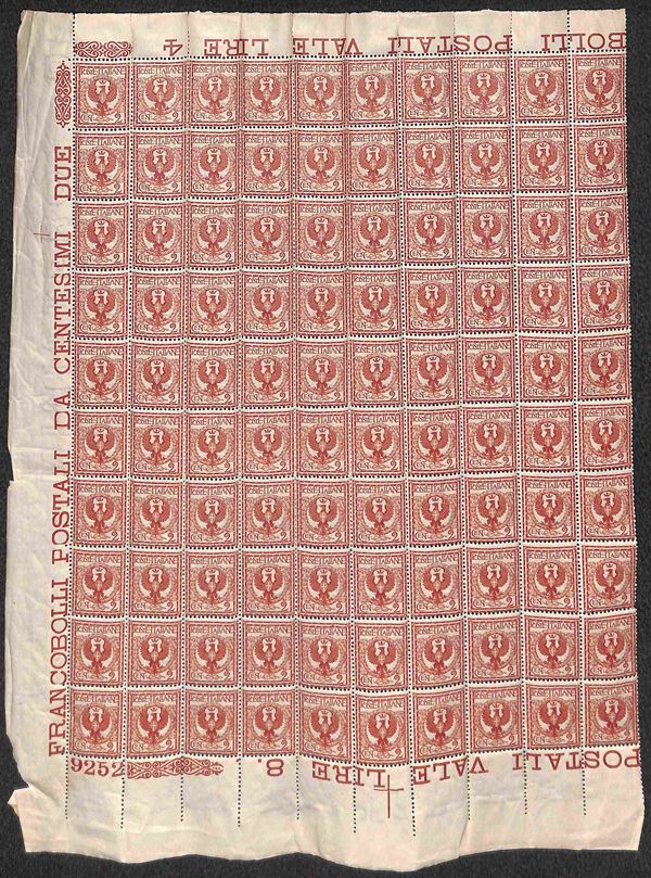 1901 - 2 cent Floreale (69) - intero foglio di 100 con 3 bordi integri e numero di tavola 9525 - gomma integra