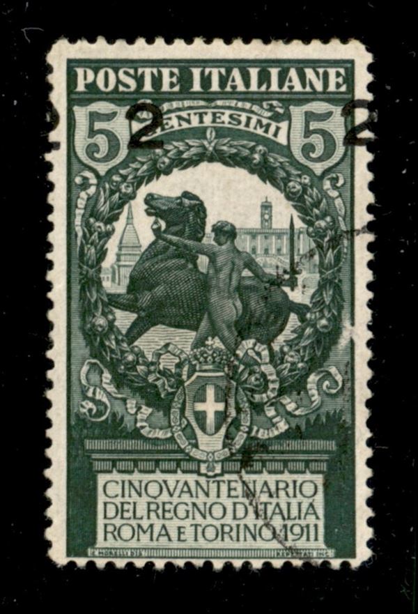 1913 - 2 lire su 5 cent (99ec) con soprastampa spostata a destra e cifre a cavallo - usato (leggerissima abrasione sul lato destro) - cert. Diena
