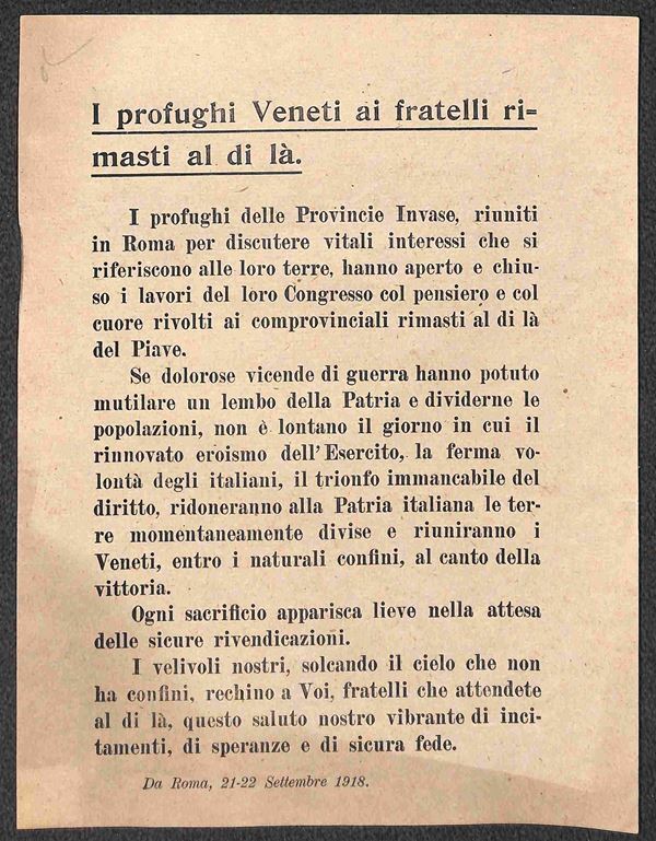 1918 (Roma 21/22 settembre) - I profughi Veneti ai fratelli rimasti al di là - volantino