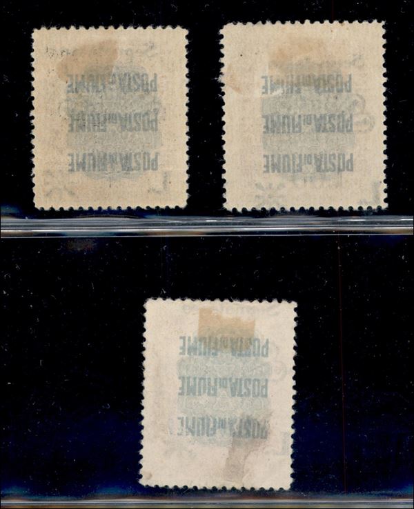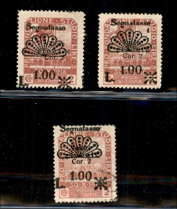 -1921 - 1 lira su 2 corone (35 - Segnatasse) - tre pezzi con soprastampe in posizioni diverse (due nuovi con gomma originale) + usato
