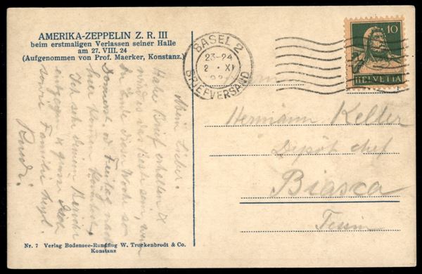 1924 (2 novembre) - Zeppelin ZR III - cartolina da Basilea per Biasca