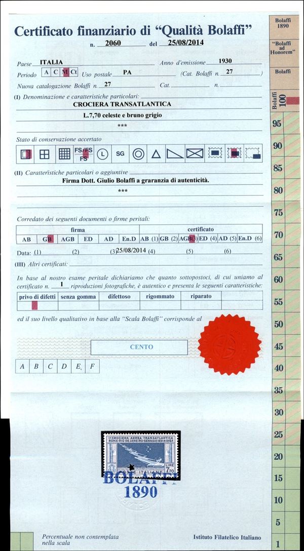 1930 - 7,70 lire Balbo (25) - gomma integra - ottimamente centrato - splendido - cert. Bolaffi 100%