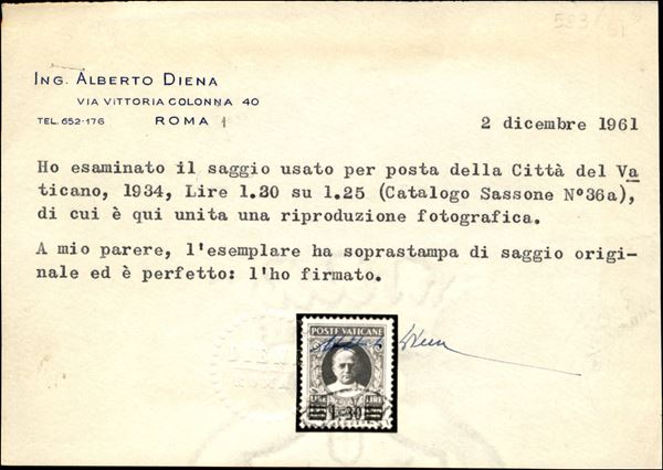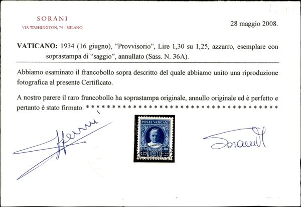 1934/1937 - Saggio - 1,30 lire Provvisori (36A) con annullo leggero - molto scuro - Bolaffi + cert. Diena + cert. Sorani
