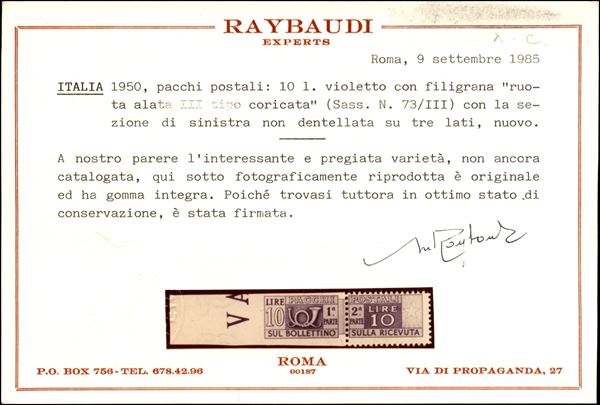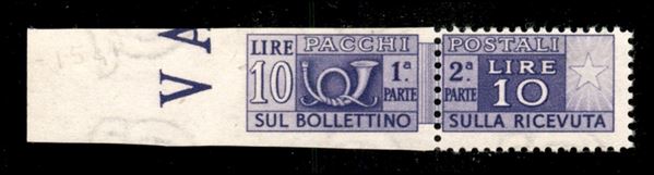 1950 - 10 lire (73/IIIs) bordo foglio - sezione sinistra non dentellata - gomma integra - molto bello (550)