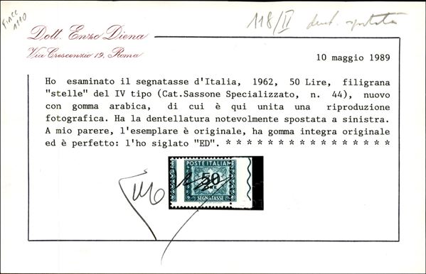 1957 - 50 lire (118//IIf) bordo foglio - dentellatura verticale spostata con parte della stampa a margine (fine riga) - gomma integra - cert. Diena