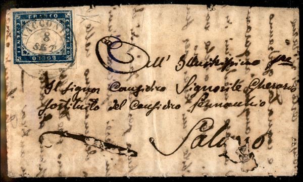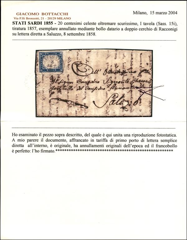 20 cent celeste oltremare scurissimo (15i) - lettera da Racconigi a Saluzzo del 8.12.58 - cert. Bottacchi