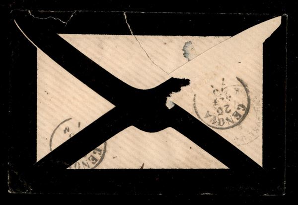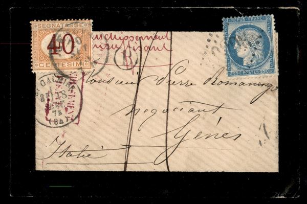 25 cent (51 - Francia) isolato su bustina a lutto da St. Galmier a Genova del 18.9.1873 tassata in arrivo per 40 cent (8 - Segnatasse)