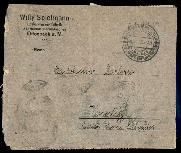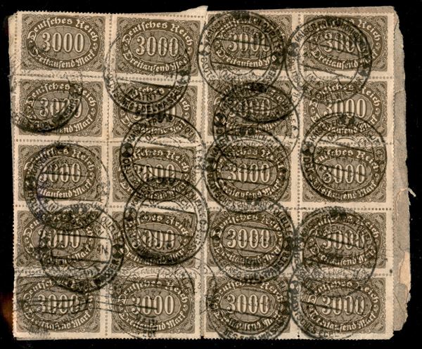 3000 marchi (254) - due blocchi di 10 al retro di busta da Offenbach a Venezia del 25.8.23