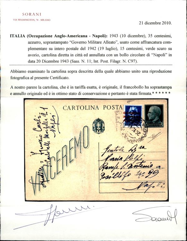 35 cent soprastampato (11) su intero postale da 15 cent (C97) per cittą - Napoli 20.12.43 - cert. Sorani