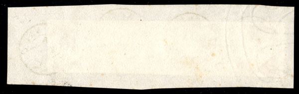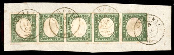 5 cent (13E) - striscia orizzontale di cinque usata su frammento - Caronno 5.7.63 (pti 11)