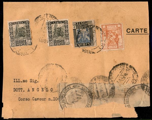 5 lire Pittorica (31) + complementari (28 due + 106) - parte di piego da Tripoli a Messina del 3.1.40 giunto rovinato e riparato d’ufficio