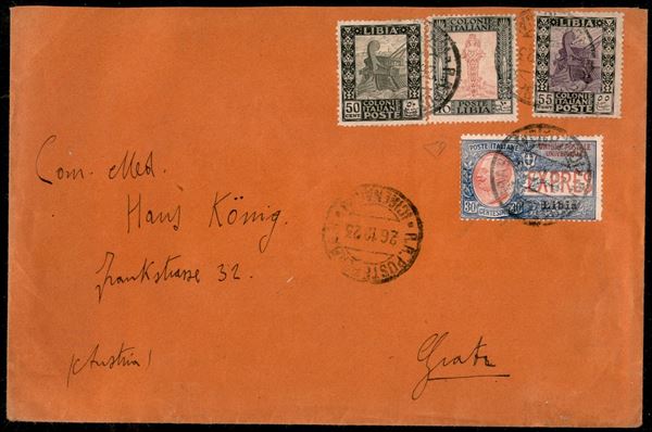 55 cent Pittorica (29) + 30 cent Espressi (2) + complementari (24 + 28) su busta da Bengasi a Gratz del 26.12.23 - Diena (1.550+)