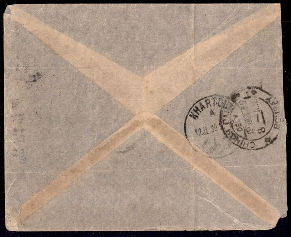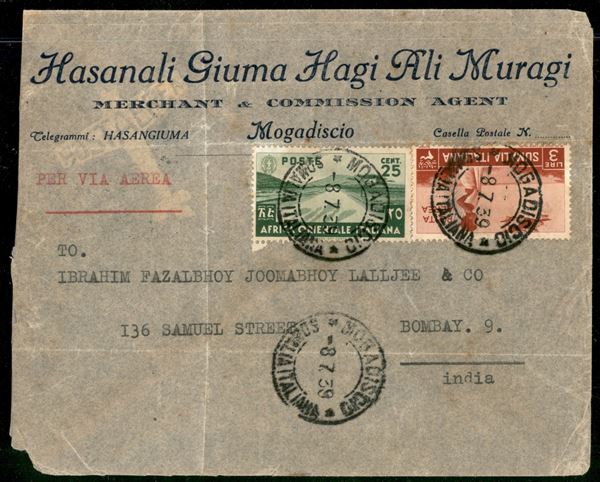 Aerogramma affrancato con 3 lire Soggetti Africani (24) + 25 cent AOI (7) da Mogadiscio a Bombay (India) del 8.7.39