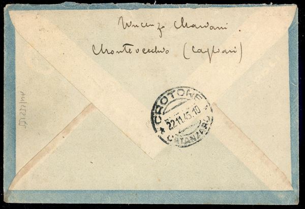 Aerogramma affrancato con due 1 lira Imperiale + 2 lire su 25 cent (519+525) siglati Bodini - in tariffa posta aerea per l'interno da Montevecchio 15.11.45 per Crotone - completa di testo all'interno
