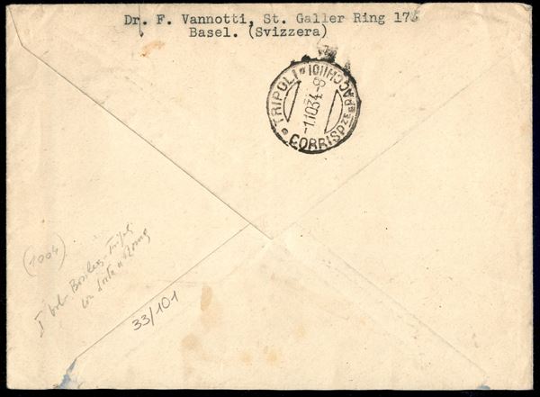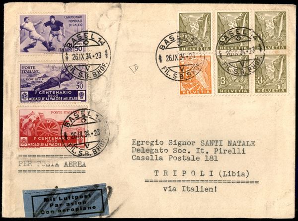 Aerogramma Basilea Tripoli (26.9.34) con affrancatura mista (Svizzera 271 cinque + 274 + Regno 359 + 371 + 372) - Diena