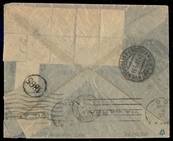 Aerogramma con affrancatura tricolore composta da Imperiale 15 cent + 25 cent + nove esemplari del 1,75 lire (246+248+254) da Imperia 14.6.33 per Buenos Aires - tariffa non comprensibile - ex coll. Provera