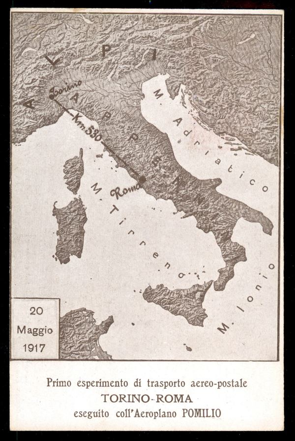 Aerogramma Pomilio - cartolina del volo Torino Roma del maggio 1917 (Longhi 809) con annullo speciale azzurro - molto rara - Chiavarello