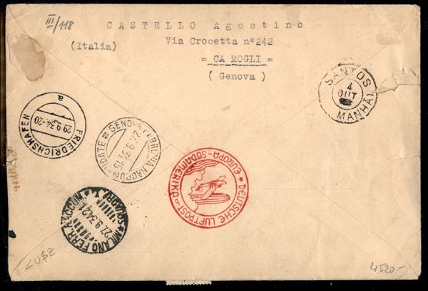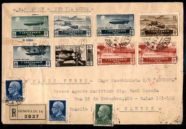 Aerogramma raccomandato via Zeppelin Europa Sudamerika affrancato con valori di Posta Aerea della serie Medaglie al Valore (74/76 + due 77 + 80 + due 82) + Imperiale (248 + due 253) da Genova a Santos (Brasile) del 27.9.34 - qualche piccolo strappo sulla busta