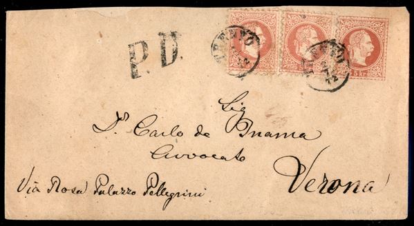 Busta postale da 5 kreuzer con complementari gemelli (due 37) da Trento a Verona del 2.7.1872