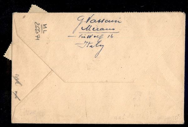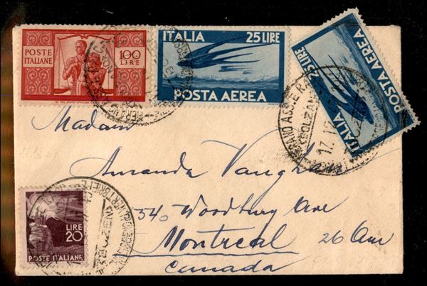 Bustina affrancata con 100 lire Democratica (565) + 20 lire (561) + due 25 lire Posta Aerea (131) da Merano a Montreal (Canada) del 17.12.47
