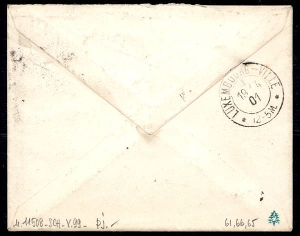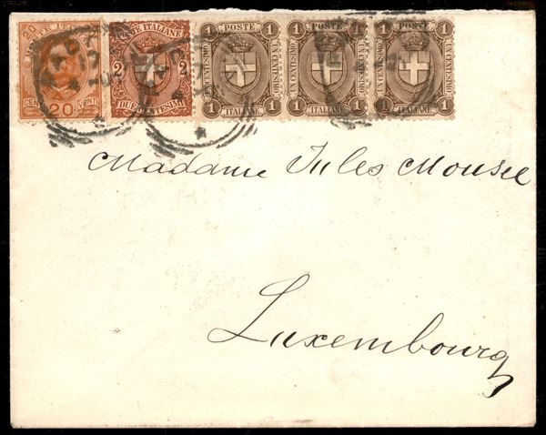 Bustina con affrancatura tricolore composta da tre 1 cent + 2 cent Stemma + 20 cent Umberto I (65+66+61) da Padova 17.4.01 per Lussemburgo - ex coll. Provera