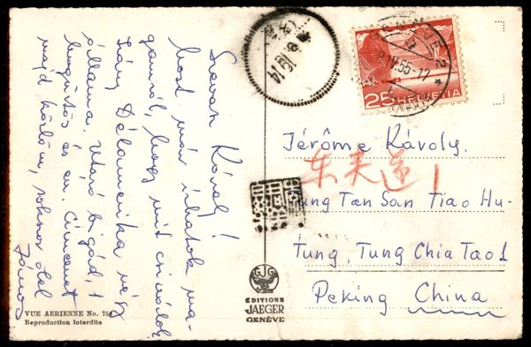 Cartolina da Ginevra a Pechino del 28.4.55 affrancata per 25 cent