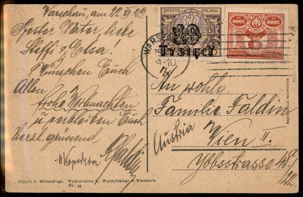 Cartolina da Varsavia a Vienna del 9.10.1923 con affrancatura di 15000 marchi (184 + 185)
