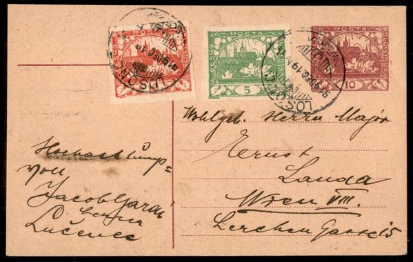 Cartolina postale da 10 heller con complementari (3 + 4) da Losonc a Vienna del 19.12.1919
