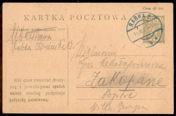 Cartolina postale da Rabka (azzurro) a Zacopane del 14.7.1920