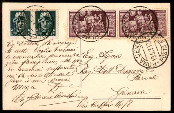 Cartolina via aerea da Roma Centro Posta Aerea 13.5.39 per Genova affrancata con coppia 15 cent verde scuro Imperiale + coppia 25 cent lilla Aerea Augusto (246 + A106) - non comune