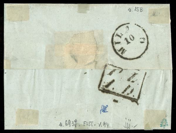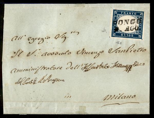 Dongo 9. Ago - 20 cent azzurro scuro (15B) su bustina per Milano - annullo in cartella al retro PD - 1.D. - tutti annulli di fornitura austriaca - interessante insieme - ex coll. Provera
