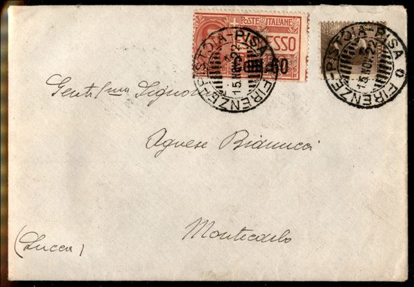 Firenze Pistoia Pisa - 60 cent (6 Espressi - varietà tipo 6 laa) con dentellatura verticale spostata e diciture a margine + complementare (84) - busta consegnata direttamente al vagone postale come si evince dal testo accluso
