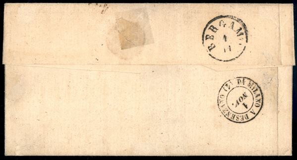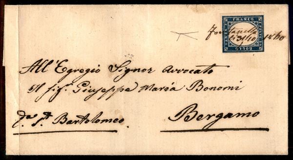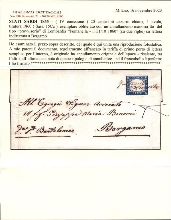 Fontanella 31.10.1860 (provvisorio di Lombardia) annullamento manoscritto su 20 cent azzurro chiaro (15Ca) su lettera indirizzata a Bergamo - ultima data nota per questo tipo di annullatore - molto bella e fresca - cert Bottacchi