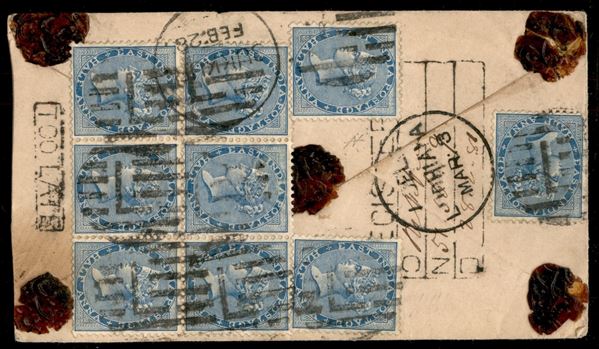 Gemelli - Bustina postale da 1/2 anna raccomandata con affrancatura complementare multipla al retro (17 nove) per Londhiana del 28.2.1881