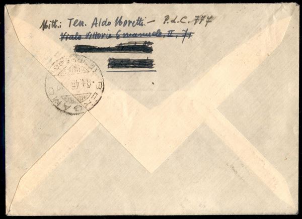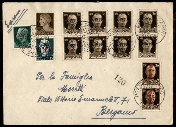 Gemelli - GNR (471 + 472 + 474 + quattro coppie verticali del 475) + Fascetti (492 in coppia con fascio rosso biaccato) - Espresso dalla Posta da Campo 707 a Bergamo del 4.1.1945 - tardo uso di rara affrancatura multipla mista tollerata su busta regolarmente viaggiata