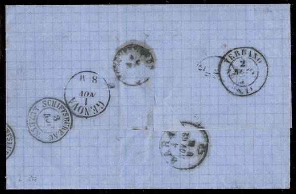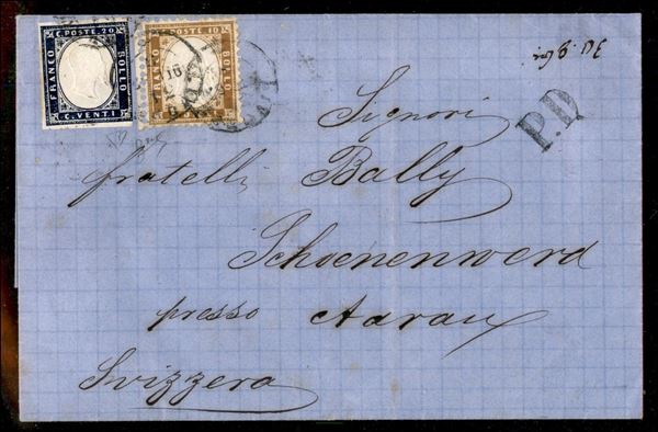 Involucro di lettera con affrancatura mista composta da 20 cent indaco (15E Sardegna + 10 cent (1 Regno) bordo di foglio a sinistra da Livorno per Aarau del 31 OTT 62