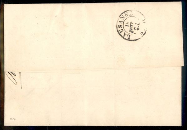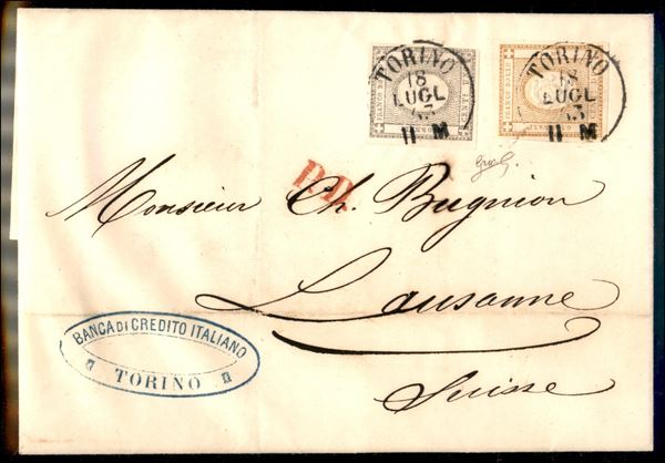 Lettera con affrancatura mista composta da 1 cent per Stampati (19d Sardegna) + 2 cent per stampati (10 Regno) da Torino per Losanna del 18 LUGL 63