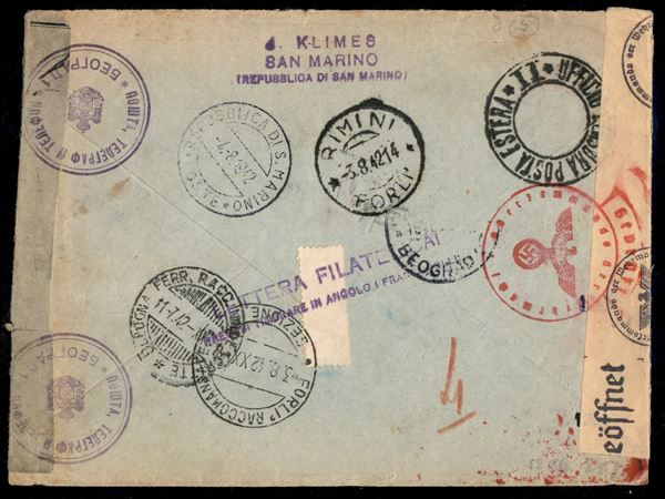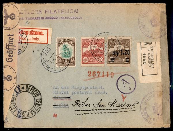 Lettera filatelica raccomandata da San Marino per Belgrado del 10.7.42 - affrancata con 60 cent (115) + 1,20 lire su 90 (120) + 1 lira (149) - Ufficio Censura Posta Esterna II