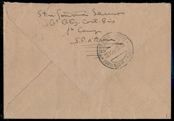 Lettera via aerea da Sampierdarena 20.11.42 a Fiume affrancata con 10 cent arancio e bruno Galilei + tre valori 30 cent Propaganda di Guerra - in tariffa e con bollo di arrivo