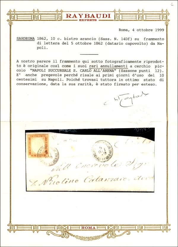 Napoli Succursale S. Carlo all’Arena (P.ti R1) - 10 cent (14Df - Sardegna) su frammento del 5.10.62 - Diena + cert.oro Raybaudi