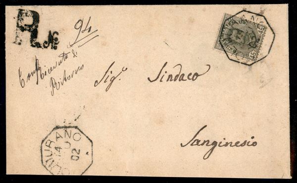 Raccomandata affrancata con 45 cent Umberto I (63) da Olmurano 14 GIU 02 per Sanginesio