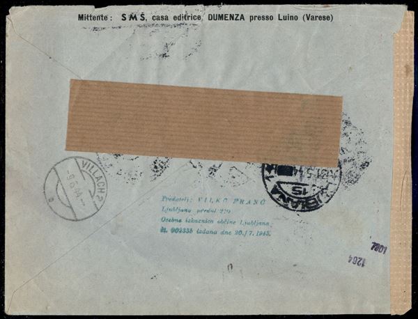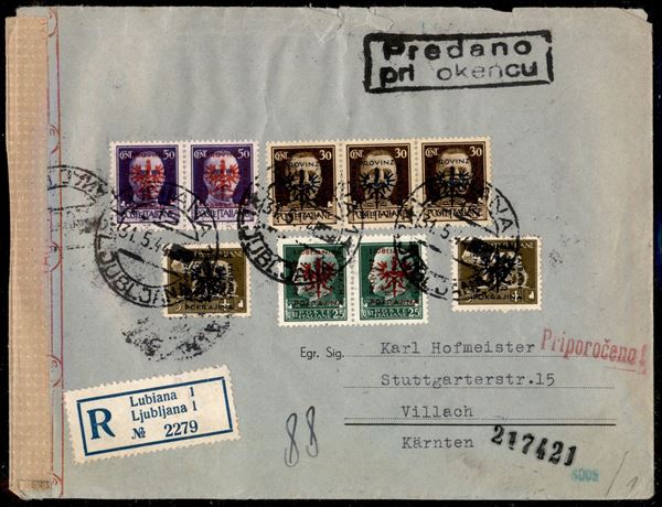 Raccomandata affrancata per 2,50 lire (due 1+ coppie 5+8 + striscia di tre 6) da Lubiana a Villach del 31.5.44