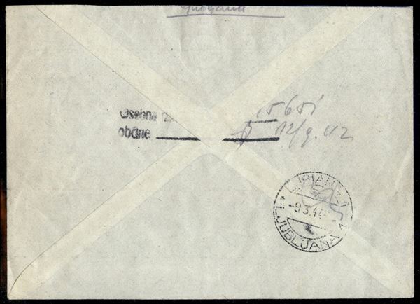 Raccomandata espresso con affrancatura di 8 valori di posta ordinaria (1+4/11) pił 7 valori segnatasse (3/9) da Lubiana a Milano del 9.3.44