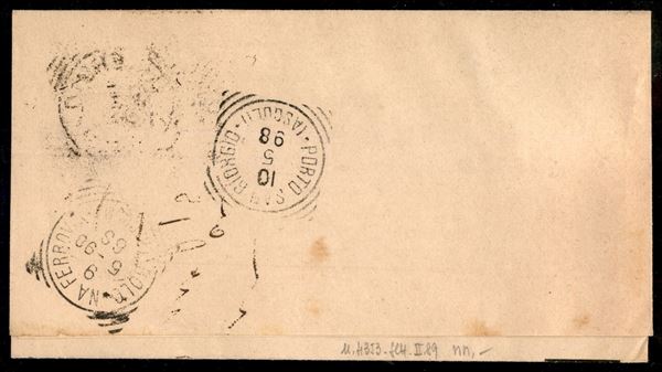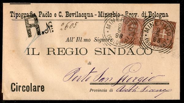 Stampato raccomandato affrancato con 10 cent Umberto I (60) + 2 cent stemma (66) in tariffa da Minerbio 9.5.98 per Porto San Giorgio - ex coll. Provera