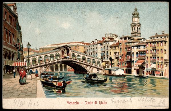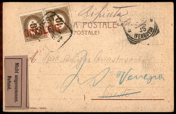 Territori Italiani d'Austria - Ungultig (rosso) su coppia del 10 heller (16 - segnatasse) annullata in arrivo a Trieste (5.3.06) - cartolina da Venezia non affrancata e rifiutata