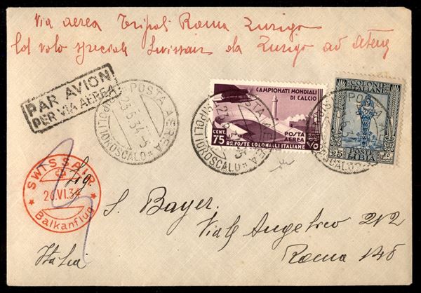 Tripoli Zurigo 23.6.34 (Longhi 3133) - aerogramma del volo poi cancellato e giunto a destinazione per via ordinaria - Chiavarello