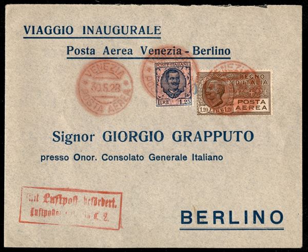 Venezia Berlino 30.5.28 (Longhi 1845) - aerogramma affrancato con Floreale 1,25 lire + Aerea 1,20 lire annullati con guller rosso Venezia Posta Aerea