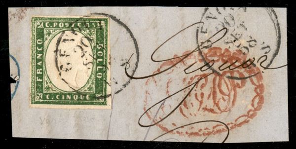 1858 - Stampa Difettosa - 5 cent (13Ah - verde giallo) usato a Genova il 20.9.58 su frammento - cert. AG